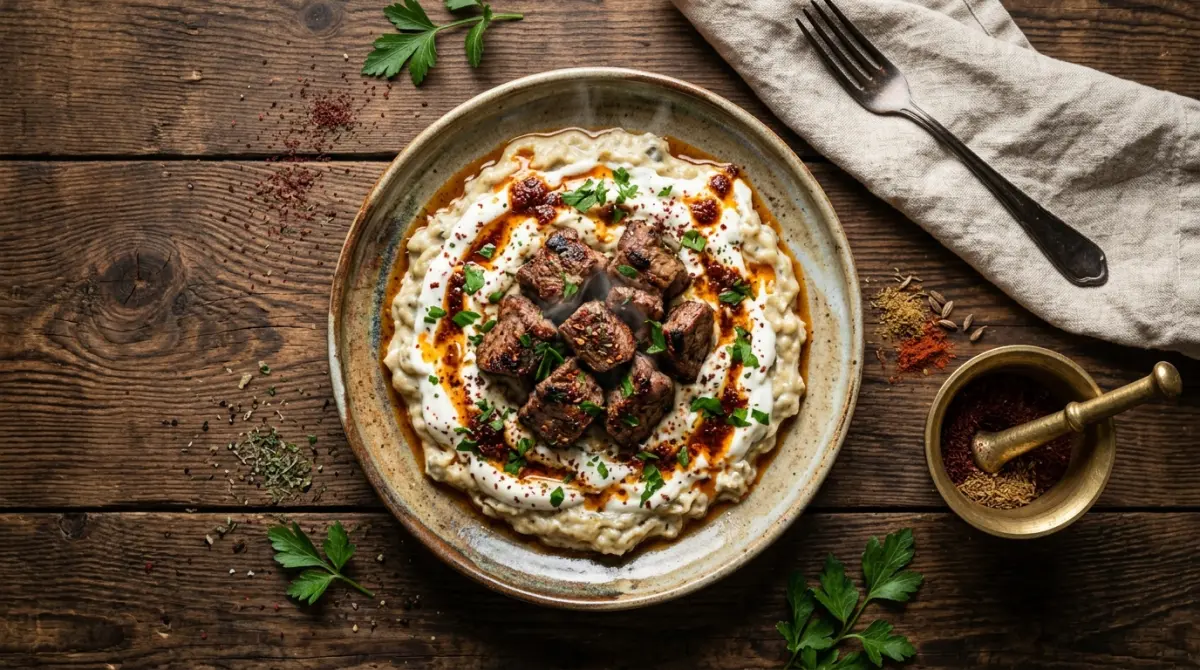 Közlenmiş patlıcan ve yoğurt yatağı üzerine baharatlı kuşbaşı etin buluşması. Gaziantep mutfağının en sevilen lezzetlerinden.