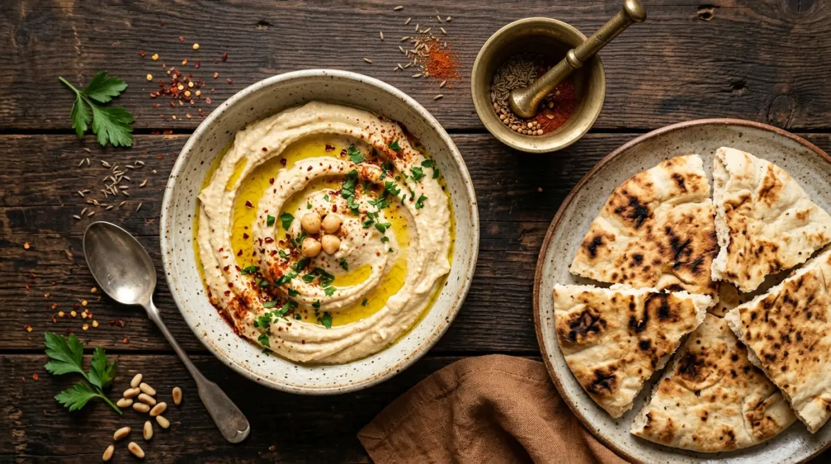 Nohut, tahin ve limonla hazırlanan kremalı humus. Üzerine zeytinyağı ve Hakan Baharat pul biber ile servis edilir.