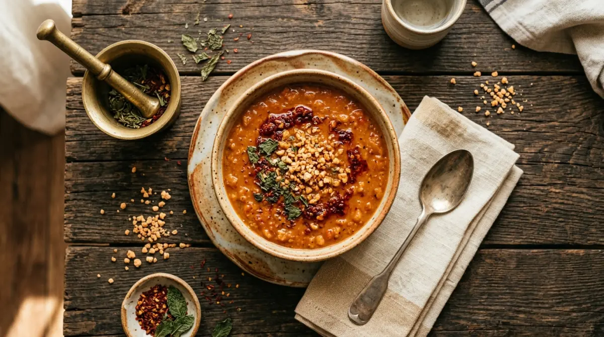 Ayrı küçük bir tavada 1 yemek kaşığı tereyağını kızdırın. Hakan Baharat pul biberini ve kuru naneyi ekleyip 10-15 saniye çevirin — baharatlar yağda kızınca aromatik bileşikleri açığa çıkar ve çorbanın üzerinde muhteşem bir lezzet katmanı oluşturur. Pul biber yanar yanmaz ocaktan alın.