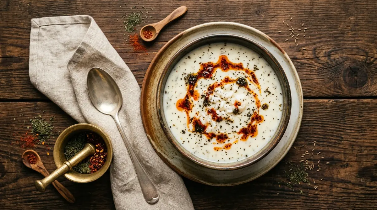 Çorbayı sıcak kaselere paylaştırın ve üzerine tereyağlı nane-pul biber sosunu gezdirin. Kırmızı ve yeşil tonların beyaz çorba üzerindeki kontrastı görsel bir şölendir. Yayla çorbası sıcak servis edilmeli ama fokur fokur kaynar olmamalıdır — 60-65°C ideal servis sıcaklığıdır. Yanında çıtır ekmek ile sunun. Yayla çorbası Anadolu'nun en kadim tariflerinden biridir ve yoğurdun probiyotik faydalarını da beraberinde taşır.